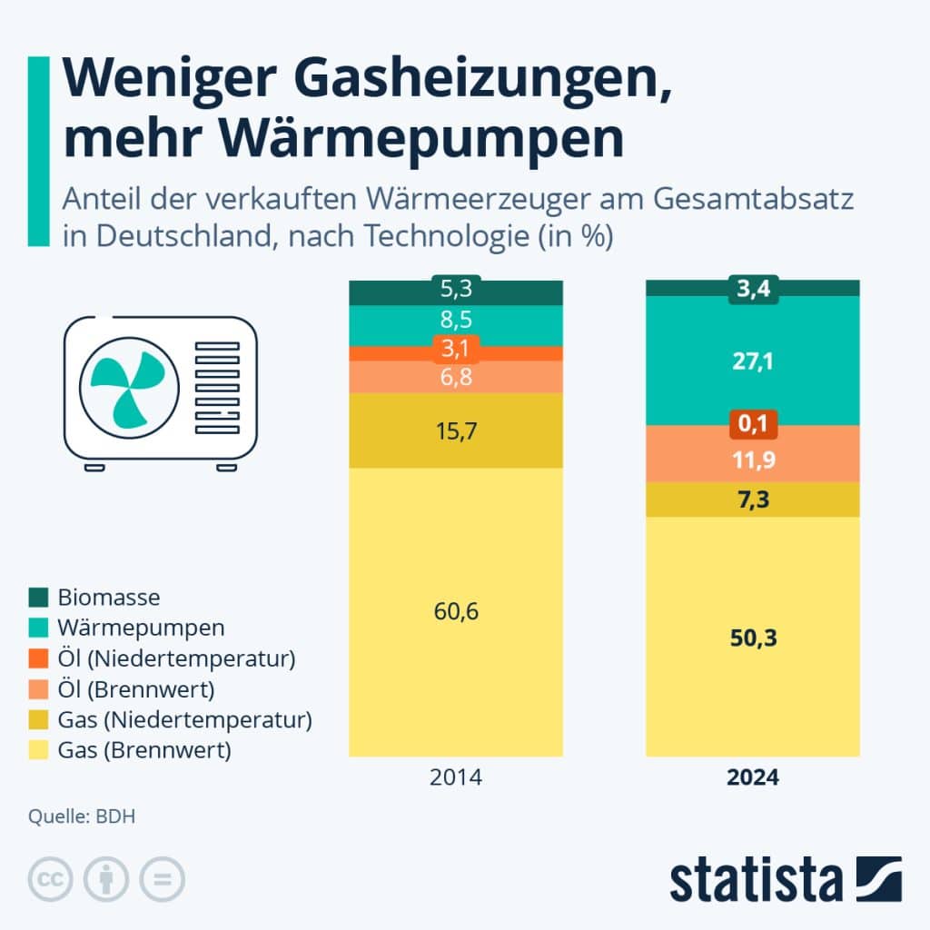 Wie die Statista-Grafik zeigt, beträgt der Anteil von Wärmepumpen am Markt für Wärmeerzeuger derzeit rund 27 Prozent. 2014 lag ihr Anteil bei lediglich 8,5 Prozent. Schlusslicht sind derzeit Biomasse- und Ölheizungen: Der Anteil von Ölheizungen am Absatz der Wärmeerzeuger für Wohngebäude liegt aktuell noch bei insgesamt 12 Prozent (Brennwert- und Niedertemperatur-Ölkessel). Biomasse-Heizungen sind von 5,3 auf 3,4 Prozent geschrumpft. Das zeigen Daten des Bundesverbands der Deutschen Heizungsindustrie. Gasheizungen machen aber immer noch das Gros der abgesetzten Wärmeträger aus, auch wenn der Absatz zuletzt rückläufig ist. Ihr Anteil liegt derzeit bei rund 58 Prozent, nachdem er 2014 noch bei über 76 Prozent lag.
