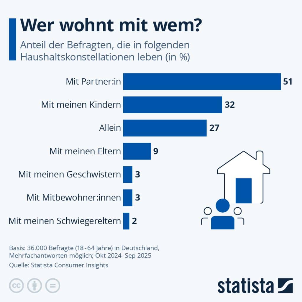Blickt man hinter deutsche Haustüren, erlebt man bei der Frage, in welchen Haushalts-Konstellationen die Menschen zusammenleben, vergleichsweise wenig Überraschungen. Einer Umfrage der Statista Consumer Insights zufolge wohnen die meisten der Befragten mit ihrem Partner oder Partnerin zusammen. Mit ihren Kindern leben 32 Prozent der Befragten, alleine 27 Prozent. Deutlich seltener gibt es Menschen, die mit ihren Eltern zusammenleben (neun Prozent der Befragten). Gemeinsam mit ihren Geschwistern oder Mitbewohner:innen wohnen jeweils drei Prozent. Das Zusammenleben mit den Schwiegereltern ist für lediglich zwei Prozent der Befragten die aktuelle Wohn-Situation.