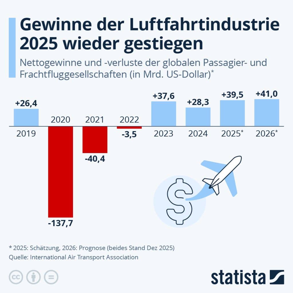 Die weltweite Luftfahrtindustrie hat die Pandemie-bedingten Turbulenzen hinter sich gelassen und wird nach jüngsten Schätzungen der International Air Transport Association (IATA) im Jahr 2025 deutlich in der Gewinnzone liegen. So prognostiziert die IATA für das Jahr 2025 kürzlich einen Nettogewinn von rund 40 Milliarden US-Dollar. Gegenüber 2024 wäre das ein Plus von 11,2 Milliarden US-Dollar. Die IATA hat ihre Prognose gegenüber dem vorangegangen Ausblick aus dem Juni 2025 nach oben korrigiert – zu jenem Zeitpunkt hatte sie noch mit einem Nettogewinn von 32,4 Milliarden US-Dollar gerechnet.