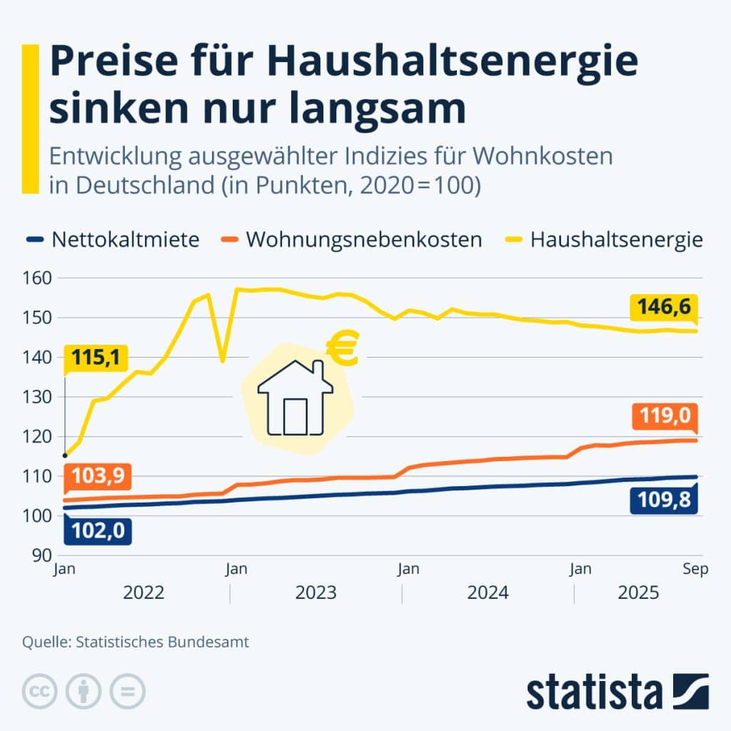Die Mieten in Deutschland steigen weiter kontinuierlich und relativ gemäßigt – die Kosten für Haushaltsenergie sind hingegen seit Beginn des Jahres 2022 sprunghaft angestiegen und sinken bislang nur langsam. Wie die Statista-Grafik auf Basis von Daten des Statistischen Bundesamts zeigt, hat der entsprechende Index deutlich zugelegt und liegt im September 2025 um rund 27 Prozent über dem Niveau des Januar 2022. Die Unsicherheiten auf den Energiemärkten und die zeitweise angespannte Versorgungslage mit Erdgas seit dem Angriff Russlands auf die Ukraine haben laut Statistischem Bundesamt zu den hohen Energiepreissteigerungen beigetragen. Gegenüber September 2024 sind die Kosten für Haushaltsenergie nur um 1,9 Prozent gesunken.