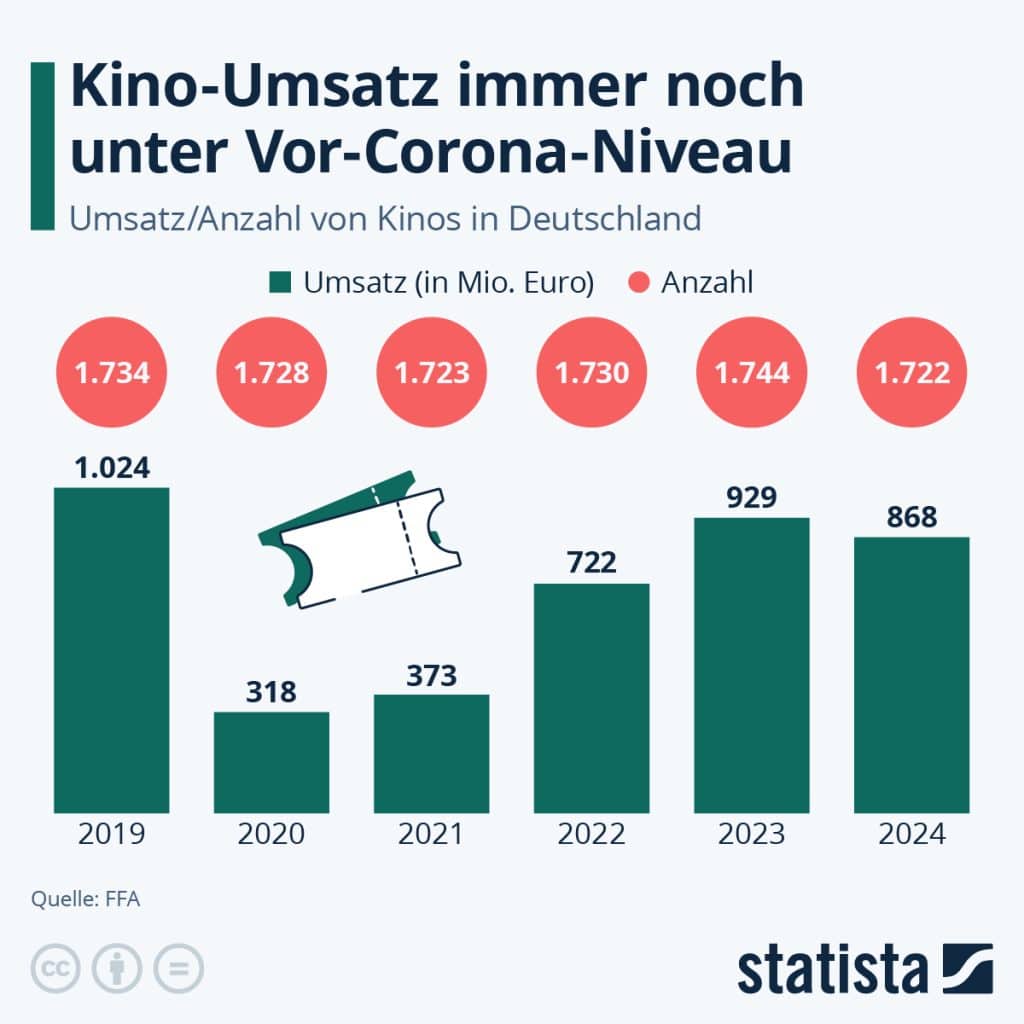 Blockbuster wie der kürzlich gestartete Avatar 3 sind gut für den Kinoumsatz. Der lag hierzulande auch im Jahr 2024 noch ein ganzes Stück unterhalb des Vor-Corona-Niveaus. In der Hochphase der Pandemie hatte die Branche mit erheblichen Umsatzeinbußen zu kämpfen, wie der Blick auf die Statista-Grafik verdeutlicht.