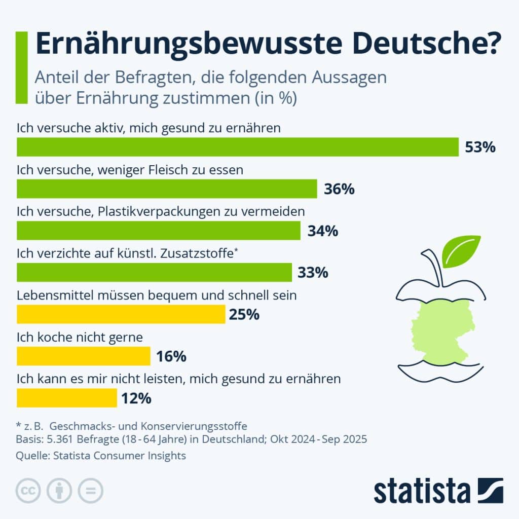 Wie gesund ernähren sich die Deutschen? In einer Umfrage des Statista Consumer Insights geben knapp über die Hälfte der Befragten an, dass sie versuchen, sich aktiv gesund zu ernähren. Viele versuchen zudem, ihren Fleischkonsum zu beschränken und auf künstliche Zusatzstoffe im Essen zu verzichten. In der Umfrage kamen jedoch auch Verhaltensweisen ans Licht, die der Gesundheit nicht eben zuträglich sind: So geben ein Viertel der Befragten an, dass Lebensmittel für sie schnell und bequem in der Zubereitung sein sollten. 16 Prozent kochen nicht gern. Jeder achte Deutsche kann es sich sogar nicht leisten, sich gesund zu ernähren.