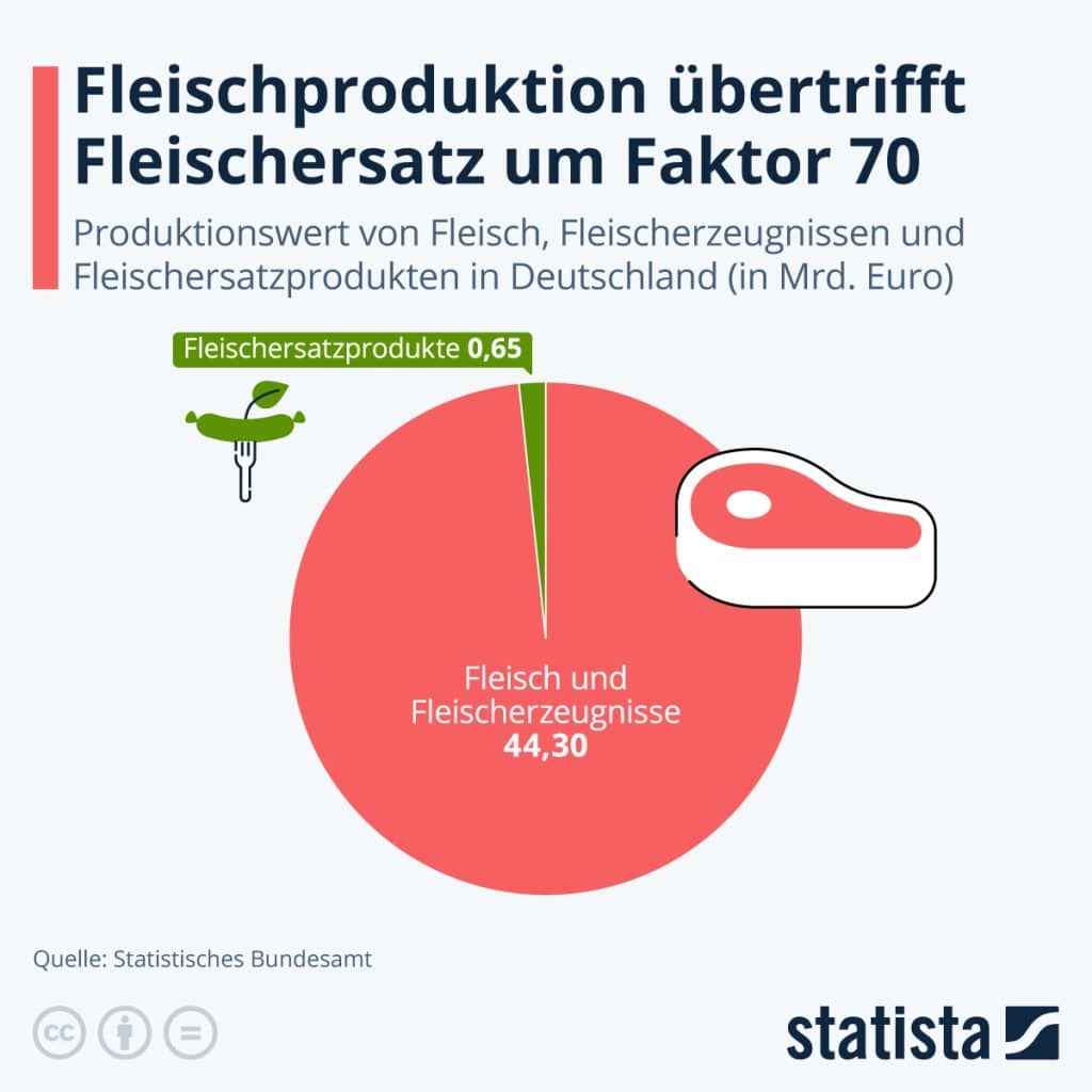 So zeigt das Beispiel Deutschland, dass Fleischersatz weiter ein Nischenprodukt ist. Daten des Statistischen Bundesamtes zufolge belief sich der Wert der hierzulande hergestellten veganen oder vegetarischen Burger, Fleischbällchen oder Nuggets auf 647,1 Millionen Euro. Zum Vergleich: Im selben Jahr wurden Fleisch und Fleischerzeugnisse im Wert von gut 44,3 Milliarden Euro produziert. Die Fleischproduktion übertrifft den Fleischersatz also um den Faktor 70. (Quelle: Statista/cw)