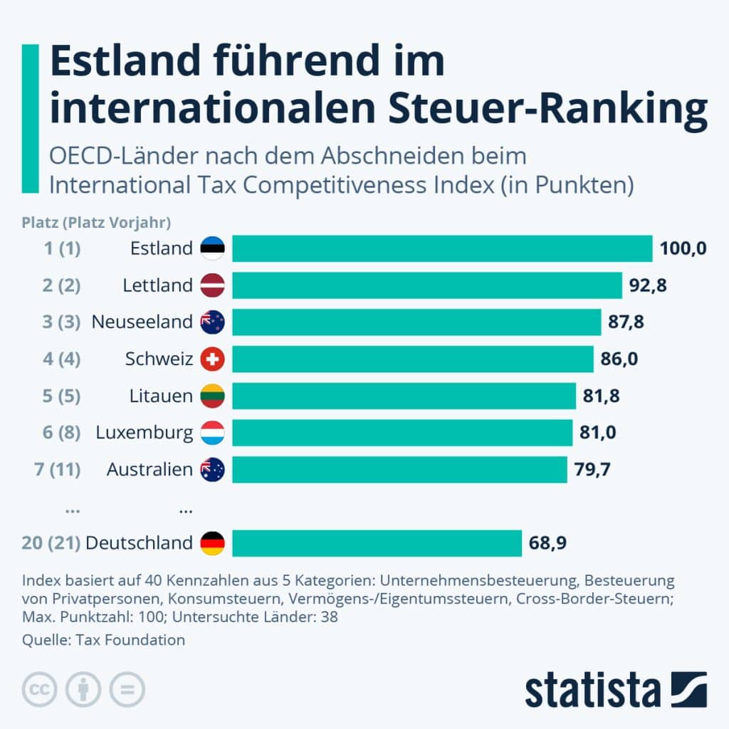 Estland liegt zum zwölften Mal in Folge auf dem ersten Platz des International Tax Compatitiveness Index der Tax Foundation. Die Spitzenposition verdankt Estland laut Tax Foundation eine Reihe positiver Merkmale seines Steuersystems: Erstens gäbe es einen vergleichsweise niedrige Körperschafts- und Einkommenssteuersätze von jeweils 20 Prozent. Außerdem beziehe sich die Grundsteuer nur auf den Wert von Grundstücken und nicht auf den Wert von Immobilien oder Kapital. Und schließlich verfüge das Land über ein territoriales Steuersystem, das die ausländischen Gewinne inländischer Unternehmen – mit wenigen Einschränkungen – zu 100 Prozent von der Inlandsbesteuerung befreit.
