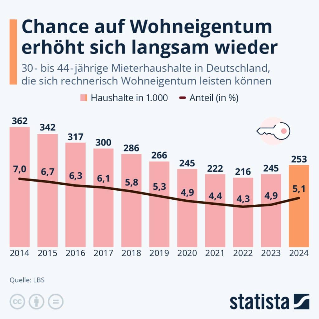 Angehende Wohneigentümern sollten mindestens 25 Prozent des Kaufpreises sowie die Erwerbsnebenkosten mit Eigenkapital bestreiten. Stellt man die regionalen Kaufpreise den regionalen Ersparnissen gegenüber, hatten 2024 nach Berechnungen von empirica (veröffentlicht durch die LBS) 253.000 jüngere Mieterhaushalte eine Chance auf Eigentum. Dies entspricht einem Anteil von 5,1 Prozent.