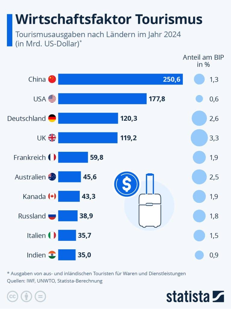 In China sind die Ausgaben von Touristen absoluten Zahlen zufolge am höchsten. Das zeigt die Statista-Infografik mit Daten der UNWTO. Im vergangenen Jahr lagen sie bei rund 250 Milliarden US-Dollar – als Anteil am Bruttoinlandsprodukt (BIP) Chinas gerechnet sind dies 1,3 Prozent. Den höchsten Anteil am BIP haben die Tourismusausgaben im Vereinigten Königreich mit 3,3 Prozent. Auch Russland befindet sich in der Liste der 10 Länder mit den höchsten Tourismusausgaben. Dies mag zunächst überraschen, da die Zahl der Touristenankünfte in Russland nach Beginn des Krieges gegen die Ukraine eingebrochen sind und bist heute nicht wieder das Vorkriegsniveau erreicht haben. Die Tourismusausgaben Russlands dürften daher zu einem überwiegenden Teil aus Ausgaben von inländischen Touristen bestehen.