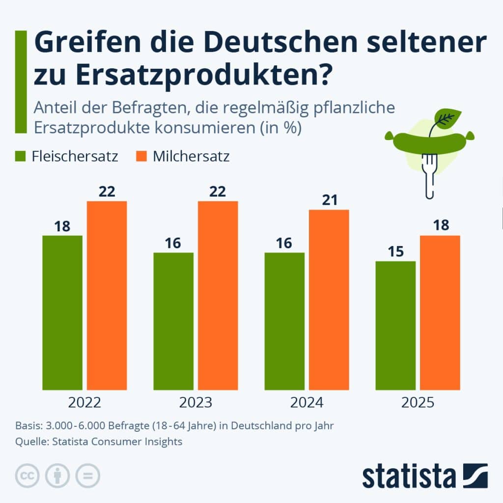 Das sind zwar etwas weniger als in den Vorjahren, aber bei einer Schwankungsbreite von zwei Prozent lässt sich hier kein klarer Trend erkennen. Etwas höher ist der Anteil bei Milchersatzprodukten, die aktuell von 18 Prozent der Umfrageteilnehmer:innen regelmäßig konsumiert werden. (Quelle: Statista/cw)