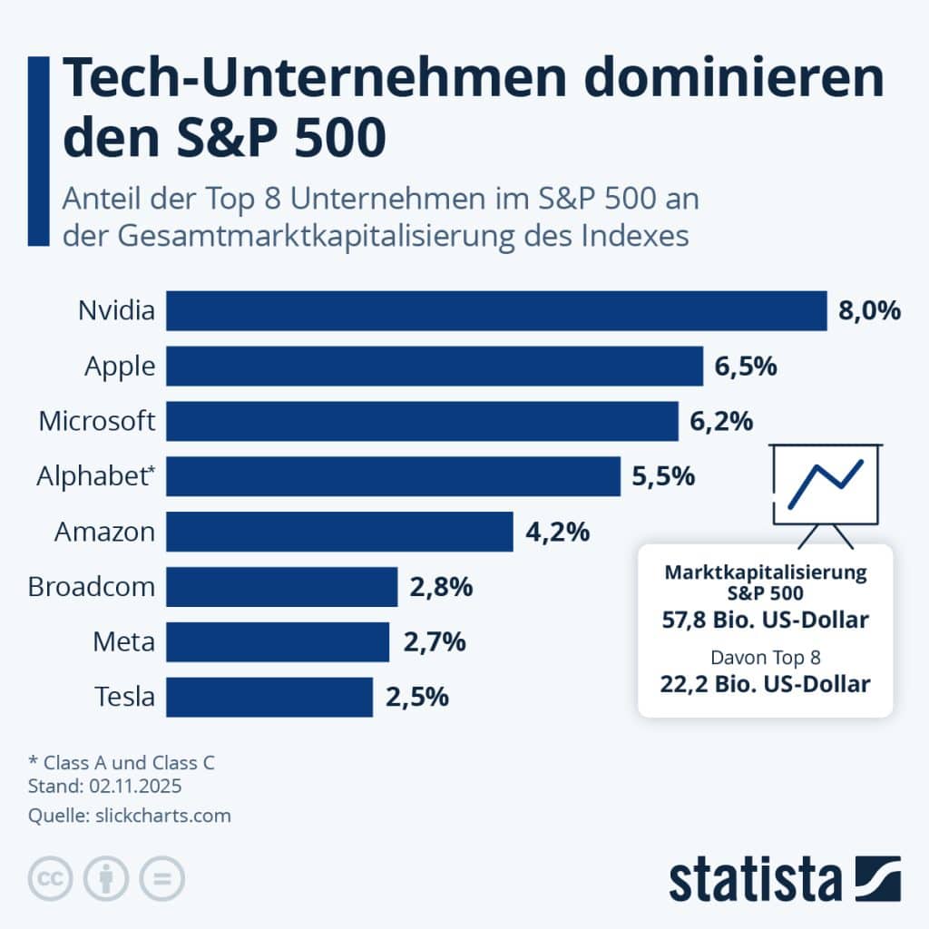Die ersten acht Unternehmen stehen für etwas mehr als 38 Prozents der Marktkapitalisierung aller 500 gelisteten Unternehmen. Auf Platz zwei und drei liegen Apple und Microsoft mit jeweils über sechs Prozent, gefolgt von Alphabet (5,5 Prozent) und Amazon (4,2 Prozent). Die ersten Nicht-Tech-Unternehmen sind Berkshire Hathaway (1,7 Prozent) und JPMorgan Chase (1,4 Prozent) . (Quelle: Statista/cw)