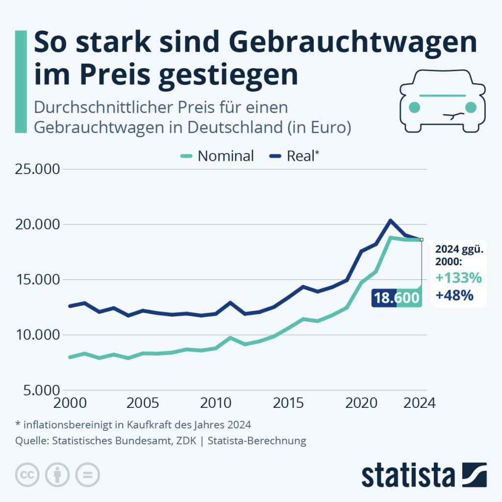 Der durchschnittliche Preis für einen Gebrauchtwagen in Deutschland ist seit dem Jahr 2000 deutlich gestiegen. So kostete ein gebrauchter Personenkraftwagen (Pkw) im Jahr 2000 nominal im Schnitt rund 8.000 Euro, 2024 waren es hingegen 18.600 Euro. Dies entspricht einer Zunahme von 133 Prozent. In realen Preisen gerechnet, also inflationsbereinigt auf Basis der Kaufkraft des Jahres 2024, liegt diese Zunahme dagegen bei nur 48 Prozent. Die Verbraucherpreise sind im selben Zeitraum um 68 Prozent gestiegen. Die Preise für gebrauchte Pkw sind also ebenfalls in geringerem Maße gestiegen als die Verbraucherpreise insgesamt und als es die hohen nominalen Preise auf den ersten Blick vermuten lassen würden.