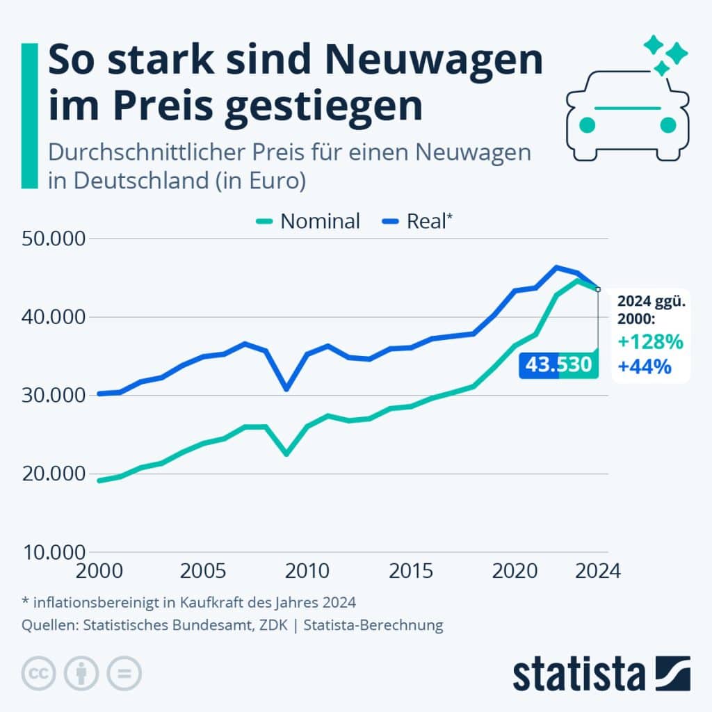 Eine Mischung aus höheren Produktionskosten, technologischen Anforderungen, regulatorischem Druck und Marktmechanismen hat dazu geführt, dass die Preise für neue Personenkraftwagen (Pkw) in Deutschland seit dem Jahr 2000 spürbar gestiegen sind. So lag der Durchschnittspreis für einen Neuwagen im Jahr 2000 nominal (nicht inflationsbereinigt) bei rund 19.000 Euro – bis 2024 ist er auf über 43.000 Euro gestiegen. Dies entspricht einer Steigerung von 128 Prozent, wie die Statista-Infografik mit Daten des Deutschen Kraftfahrzeuggewerbe Zentralverbands zeigt. Inflationsbereinigt liegt das Plus hingegen bei lediglich 44 Prozent. Die Verbraucherpreise sind im selben Zeitraum um 68 Prozent gestiegen. Die Preise für neue Pkw sind also in geringerem Maße gestiegen als die Verbraucherpreise insgesamt und als es die hohen nominalen Preise auf den ersten Blick vermuten lassen würden. Da die durchschnittlichen Preise im fünfstelligen Bereich liegen, fallen die Preissteigerungen den Verbrauchern in Deutschland jedoch vermutlich stärker auf als etwa bei Produkten wie Lebensmittel, Körperpflege und Reinigungsmittel.