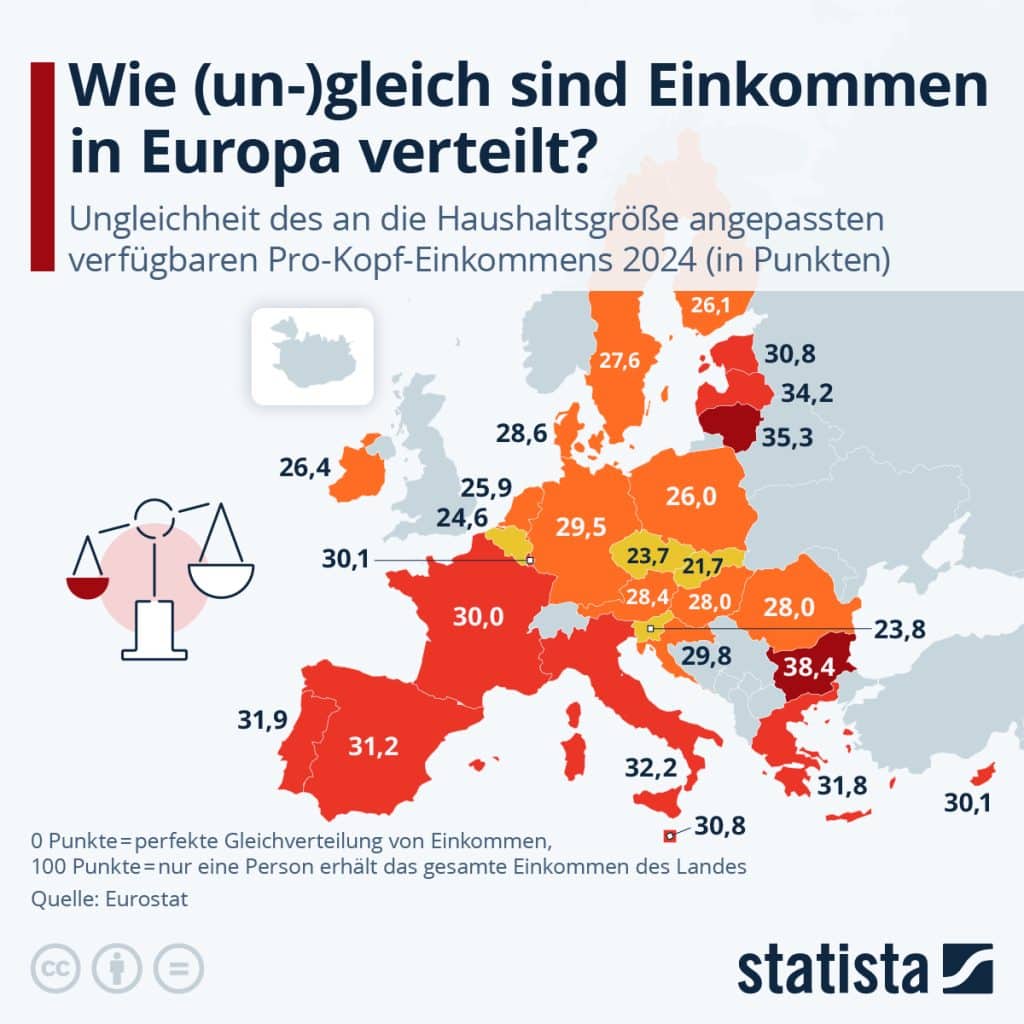 Die am so genannten Gini-Koeffizienten gemessene Ungleichheit des verfügbaren Einkommens liegt in 14 Ländern der Europäischen Union über dem EU-Durchschnitt von 29,4 Punkten. Die größten Einkommensungleichheiten innerhalb der EU wurden in Bulgarien (38,4), Litauen (35,3) und Lettland (34,2) verzeichnet. In Deutschland, Dänemark und Kroatien lagen die Gini-Koeffizienten nahe am EU-Durchschnitt. In der Slowakei, Tschechien, Slowenien und Belgien war das Einkommen gleichmäßiger verteilt; dort lag der Gini-Koeffizient unter 25,0. Das zeigt die Statista-Infografik mit Daten des Statistischen Amts der Europäischen Union (Eurostat).