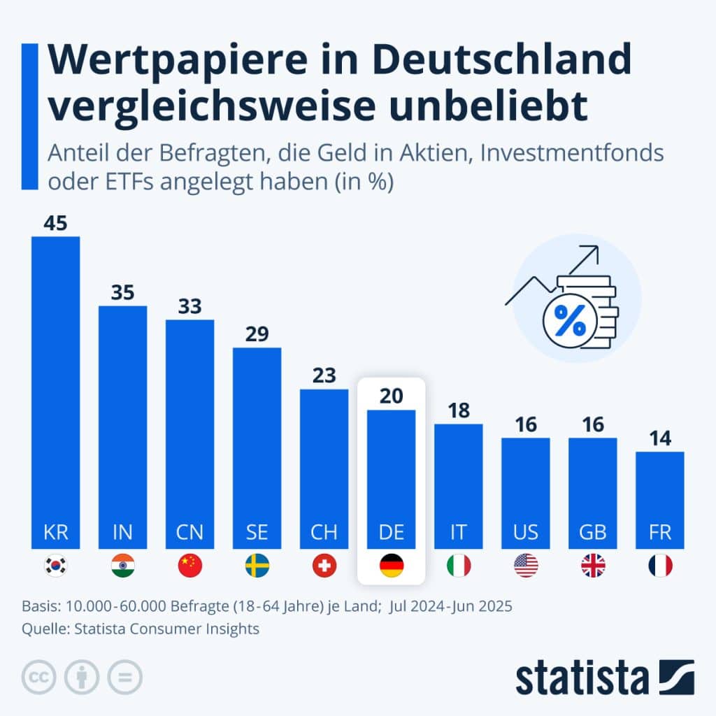 Jeder fünfte Deutsche hat Geld in Aktien, Investmentfonds oder ETFs investiert. Das ist das Ergebnis einer Umfrage der Statista Consumer Insights. Damit liegt Deutschland im unteren Mittelfeld des Ländervergleichs. Besonders weit verbreitet ist der Besitz von Wertpapieren dagegen in Südkorea, Indien und China. In vielen asiatischen Ländern gibt es weniger ausgebaute staatliche Rentensysteme. Menschen sorgen also privat stärker für ihre Altersvorsorge vor, und Aktien und Fonds sind dabei ein verbreitetes Mittel. In Deutschland ist der Besitz von Wertpapieren dagegen eher in oberen Einkommensschichten verbreitet.