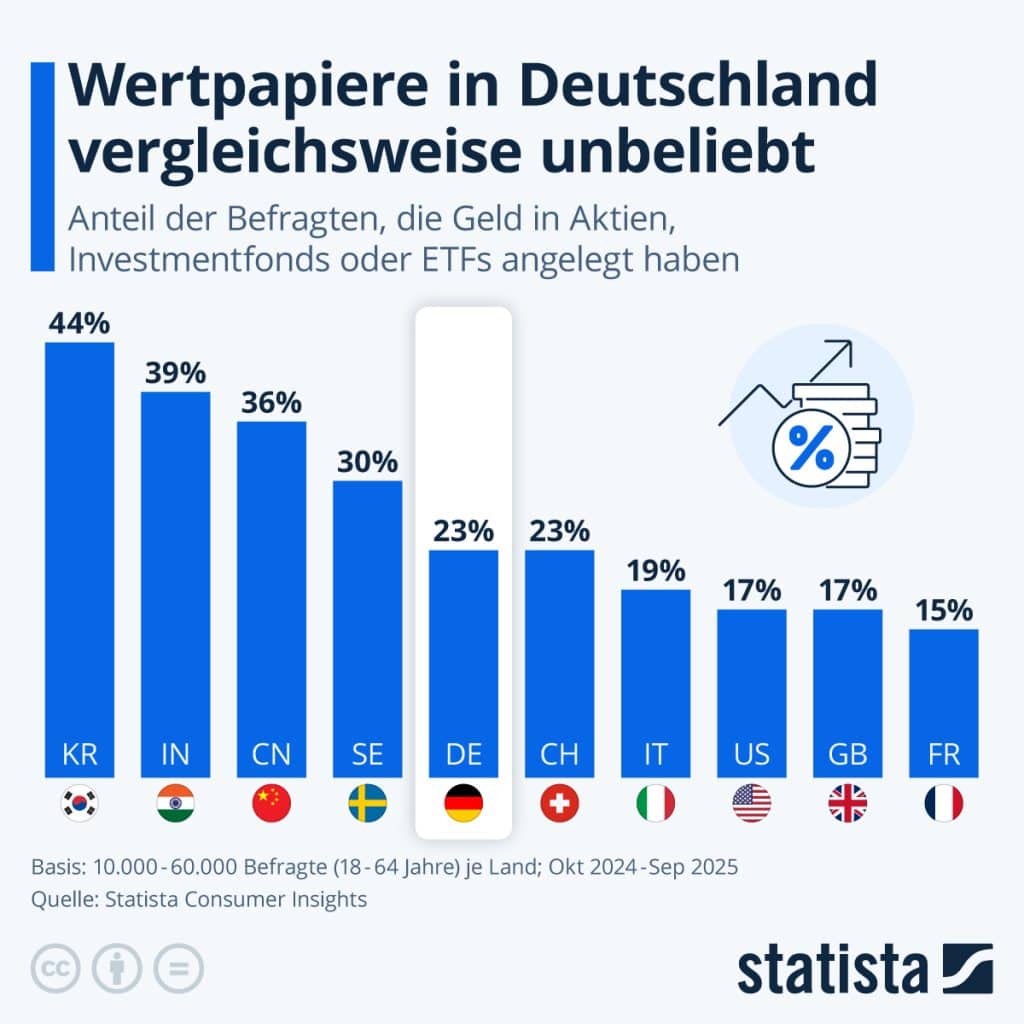 23 Prozent der im Rahmen der Statista Consumer Insights befragten Deutschen haben Geld in Aktien, Investmentfonds oder ETFs investiert. Damit liegt Deutschland im Mittelfeld des Ländervergleichs. Besonders weit verbreitet ist der Besitz von Wertpapieren dagegen in Südkorea, Indien und China. In vielen asiatischen Ländern gibt es weniger ausgebaute staatliche Rentensysteme. Menschen sorgen also privat stärker für ihre Altersvorsorge vor, und Aktien und Fonds sind dabei ein verbreitetes Mittel. In Deutschland ist der Besitz von Wertpapieren dagegen eher in oberen Einkommensschichten verbreitet.