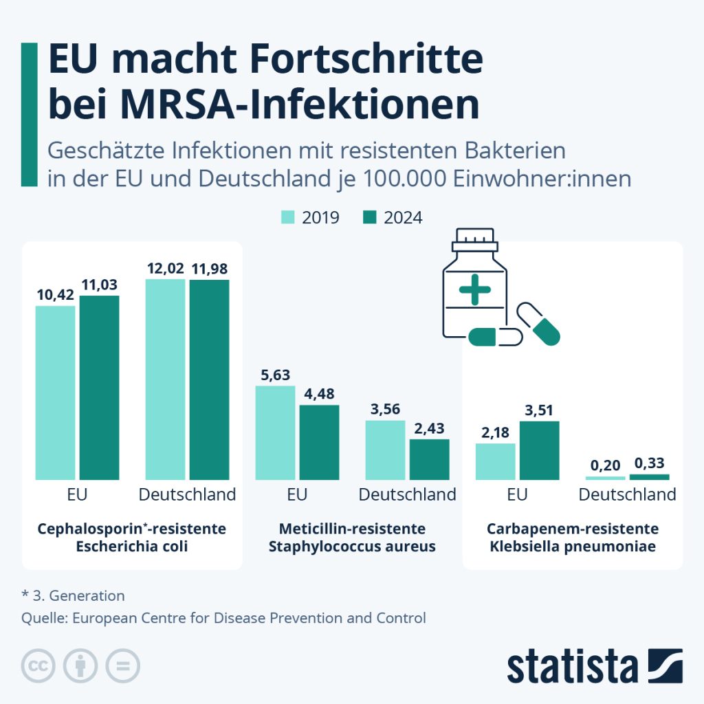 Ein aktueller Bericht der European Centre for Disease Prevention and Control macht deutlich, dass Antibiotika-Resistenzen in der Europäischen Union (EU) ein anhaltend großes Problem sind. Es gibt aber auch Fortschritte zu vermelden. Im Jahr 2024 lag die geschätzte Gesamtinzidenz von Infektionen durch Methicillin-resistente Staphylococcus aureus (MRSA) in der EU bei 4,48 pro 100.000 Einwohner:innen – damit ist dieser Wert innerhalb von fünf Jahren um über 20 Prozent zurückgegangen.