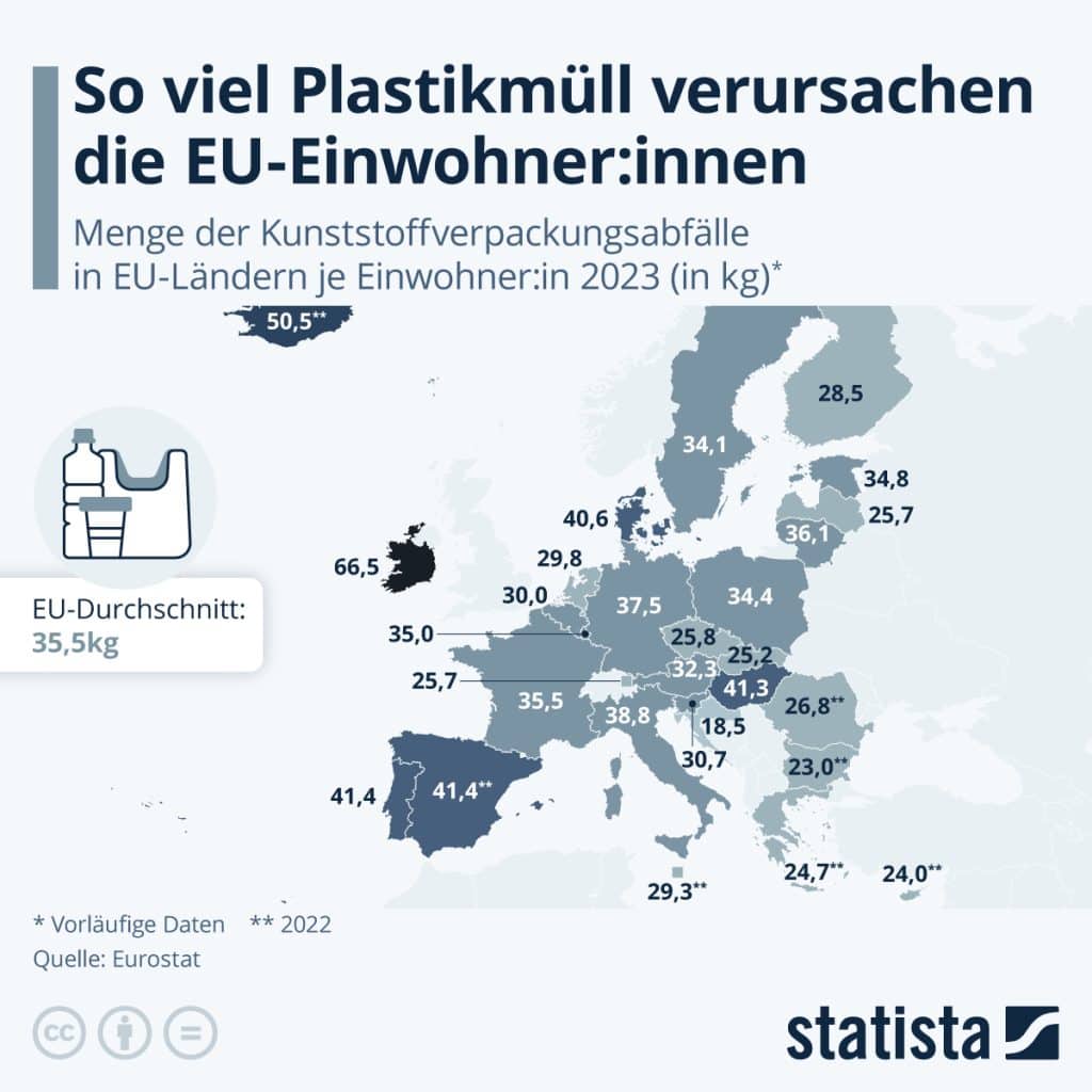 Jeder Bundesbürger hat 2023 laut Eurostat im Schnitt rund 37,5 Kilogramm Plastikverpackungsabfälle verursacht. Damit liegt Deutschland EU-weit über dem Durchschnitt, wie die Infografik von Statista zeigt. Besonders viele Abfälle verursachen den Daten zufolge die Menschen in Irland (66,5 kg), Island (50,5 kg) und auf der iberischen Halbinsel (jeweils 41,4 kg). Dagegen fallen in Kroatien, Zypern und Bulgarien pro Kopf die wenigsten Plastikabfälle an. Der EU-Durschnitt liegt bei 35,5 Kilogramm und ist damit gegenüber 2023 um etwa 500 Gramm gefallen..