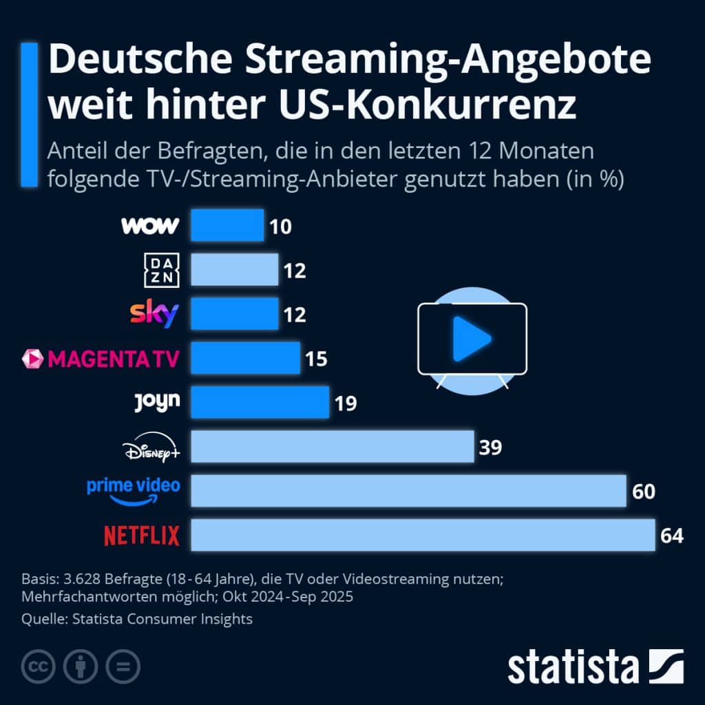 Damit ist die Tochtergesellschaft der ProSiebenSat.1 Media SE das mit Abstand erfolgreichste deutsche Streamingangebot. Ähnlich erfolgreich ist noch MagentaTV mit einer Reichweite von 15 Prozent. Dahinter folgen Sky (12 Prozent) und WOW (10 Prozent), die beide zu Sky Deutschland gehören. Allen heimischen Anbietern gemeinsam ist, dass sie keine große Konkurrenz für die Streaming-Riesen aus den USA darstellen, wie der Blick auf die Statista-Grafik zeigt. Die Nummer 1 im Markt ist aktuell Netflix (64 Prozent), gefolgt von Amazone. (Quelle: Statista/cw)
