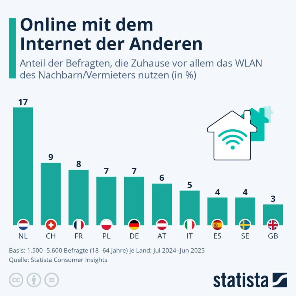 Rund sieben Prozent der für den Statista Consumer Insights befragten Menschen in Deutschland gehen zuhause hauptsächlich über das WLAN des Nachbarn oder Vermieters online. Die Umfrage sagt zwar nichts darüber aus, ob diese Mitnutzung einvernehmlich ist. Es darf aber davon ausgegangen werden, dass das nicht immer der Fall ist.
