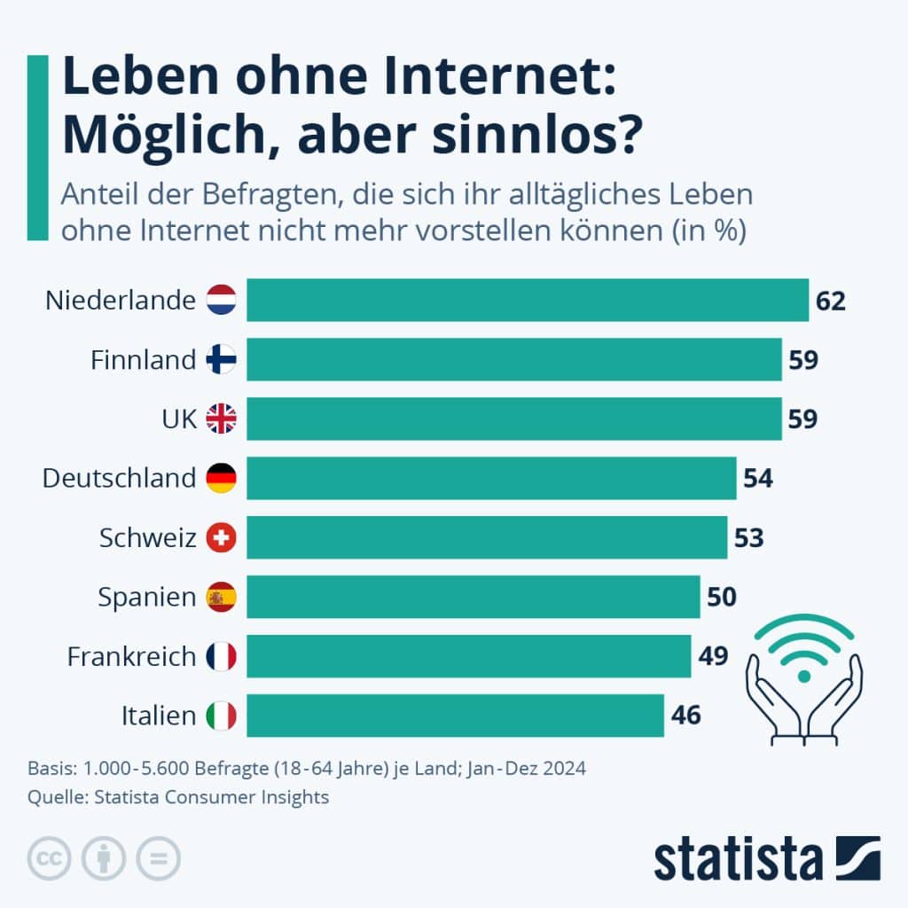Versandhandel, Reisebuchungen oder Finanzdienstleistungen, eine Vielzahl von Lebensbereichen ist mittlerweile mehr oder weniger stark ins Netz eingebunden. Trotzdem sagen nur etwa die Hälfte der zwischen 1.000 und 5.600 für die Statista Consumer Insights in Europa befragten Menschen, dass sie sich ihren Alltag nicht mehr ohne Internet vorstellen können.