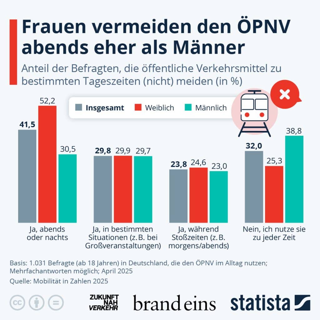 Aber nicht alle von ihnen fühlen sich immer sicher in Bus und Bahn, das gilt besonders zu später Stunde. So sagen 41 der Befragten, dass sie den ÖPNV abends oder nachts meiden, bei Frauen sind es sogar mehr als die Hälfte. Aber auch Großveranstaltungen oder Stoßzeiten wirken auf viele abschreckend, wie der Blick auf die Statista-Grafik zeigt. (Quelle: Statista/cw)