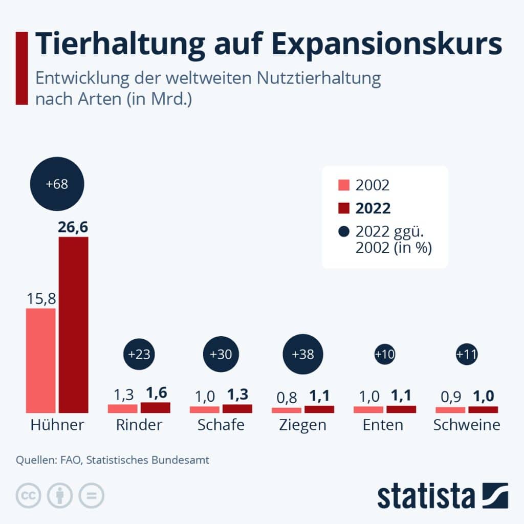 Der Mensch hält sich immer mehr Nutztiere – hauptsächlich zur Fleischproduktion, aber auch für andere Zwecke wie zur Herstellung von Dünger, von Milchprodukten oder zu Gewinnung von Wolle, Leder, Honig und ähnlichem. Wie die Statista-Infografik mit Daten der Food and Agriculture Organization of the United Nations (FAO) und des Statistischem Bundesamts zeigt, werden weltweit am meisten Hühner gehalten. Auch der Zuwachs an Tieren gegenüber dem Jahr 2002 ist bei den Hühnern am größten (+68 Prozent). Auch bei den Rindern, Schafen und Ziegen gibt es relativ hohe Zuwachsraten, bei Enten und Schweinen fallen sie dagegen geringer aus.