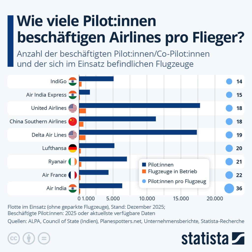 Wie die Statista-Infografik zeigt, ist das Verhältnis von Pilot:innen pro Flugzeug bei Indigo relativ niedrig. Im Vergleich mit anderen großen Fluggesellschaften liegt Indigo dabei mit 14 Pilot:innen je Flugzeug am unteren Ender der Rangliste. Die deutsche Lufthansa liegt mit 20 Pilot:innen je Flugzeug im Mittelfeld. Air India weist mit 36 Pilot:innen je Flugzeug eine relativ hohe personelle Ausstattung mit Pilot:innen auf.