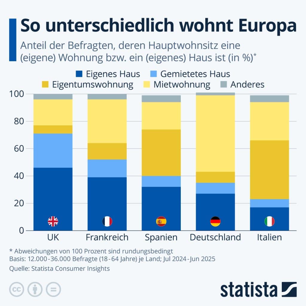 Hier leben über 70 Prozent der Menschen im eigenen (46 Prozent) oder gemieteten (25 Prozent) Haus. Der Anteil der Befragten, die in der eigenen Immobilie (Wohnung oder Haus) leben liegt bei 52 Prozent. In Italien ist die Eigentümer:innen-Quote gleich hoch, wie der Blick auf die Grafik zeigt. Allerdings sind auf dem italienischen Stiefel Eigentumswohnungen deutlich verbreiteter als eigene Häuser. (Quelle: Statista/cw)