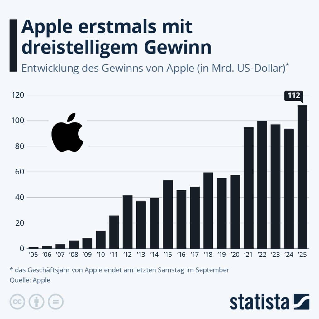 112 Milliarden US-Dollar Gewinn hat Apple im Geschäftsjahr 2025 erwirtschaftet. Das ist zuvor nur zwei anderen Unternehmen gelungen: Vodafone nach dem Verkauf seiner Anteile an Verizon Wireless im Jahr 2014 und dem staatlichen Ölkonzern Saudi Aramco in den Jahren 2018, 2021, 2022 und 2023.