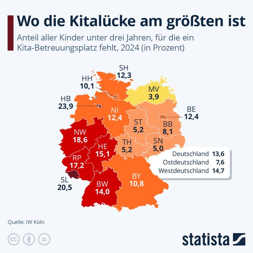 In Deutschland gibt es zu wenig Betreuungsplätze für Kinder im Alter von unter drei Jahren. Differenziert man nach Ländern, fehlten im Jahr 2024 proportional zur Gesamtzahl der Kinder in Bremen am meisten Plätze: für 23,9 Prozent aller Kinder unter drei Jahren fehlt hier ein Kita-Platz. Das ist das Ergebnis einer Erhebung des IW Köln. In Mecklenburg-Vorpommern ist die Versorgung mit Betreuungsplätzen dagegen relativ am besten: hier fehlt nur für rund 4 Prozent aller unter Dreijährigen ein Kita-Platz. Die Versorgungs-Lücke ist dabei in insgesamt in Ostdeutschland geringer (7,6 Prozent) geringer als in Westdeutschland (14,7 Prozent). Insgesamt fehlen in Deutschland 306.000 Kita-Plätze für Kinder unter drei Jahren, was 13,6 Prozent der Kinder in diesem Alter entspricht. Im Jahr 2019 lag die Betreuungslücke mit 358.000 noch etwa ein Sechstel höher.