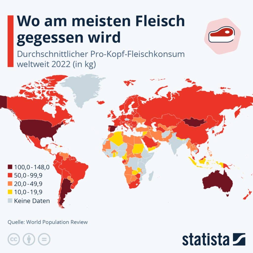 In der Mongolei, den USA, Argentinien, Israel, Australien und Spanien ist der Pro-Kopf-Konsum von Fleisch besonders hoch. Das zeigt die Statista-Weltkarte auf Basis von Daten des Portals World Population Review für das Jahr 2022. Daneben gibt es eine Reihe kleinerer Länder, in denen die 100-Kilogramm-Marke ebenfalls übertroffen wird. Hierzu zählt etwa Tonga, das mit rund 148 Kilogramm pro Kopf zugleich die globale Spitzenposition einnimmt. Deutschland liegt mit 71,3 Kilogramm an Position 59 des Ländervergleichs. Zu den Regionen mit mehreren Ländern mit einem verhältnismäßig geringem Fleischkonsum zählen Afrika und Südostasien.
