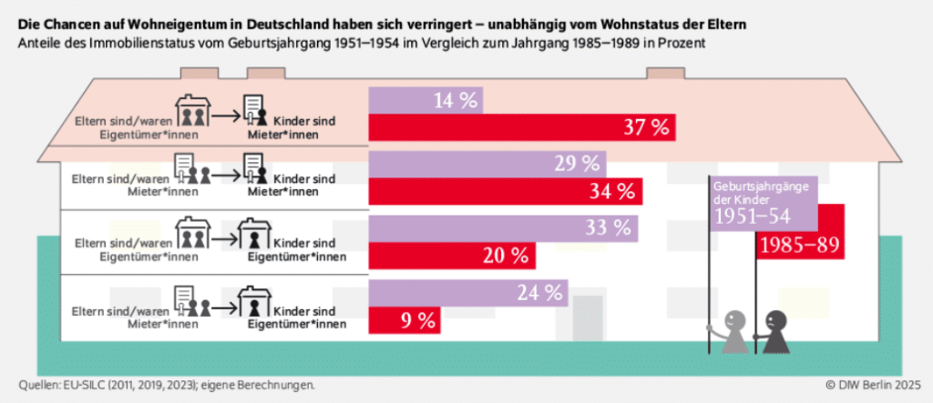 Kinder von Eltern mit Wohneigentum haben höhere Chancen, eigene Immobilien zu besitzen, als Kinder von Mieter*innen – Zusammenhang schwächt sich aber in jüngeren Generationen ab: Immer mehr wohnen zur Miete – Abbau von Eigenkapitalhürden könnte sinnvoll sein.