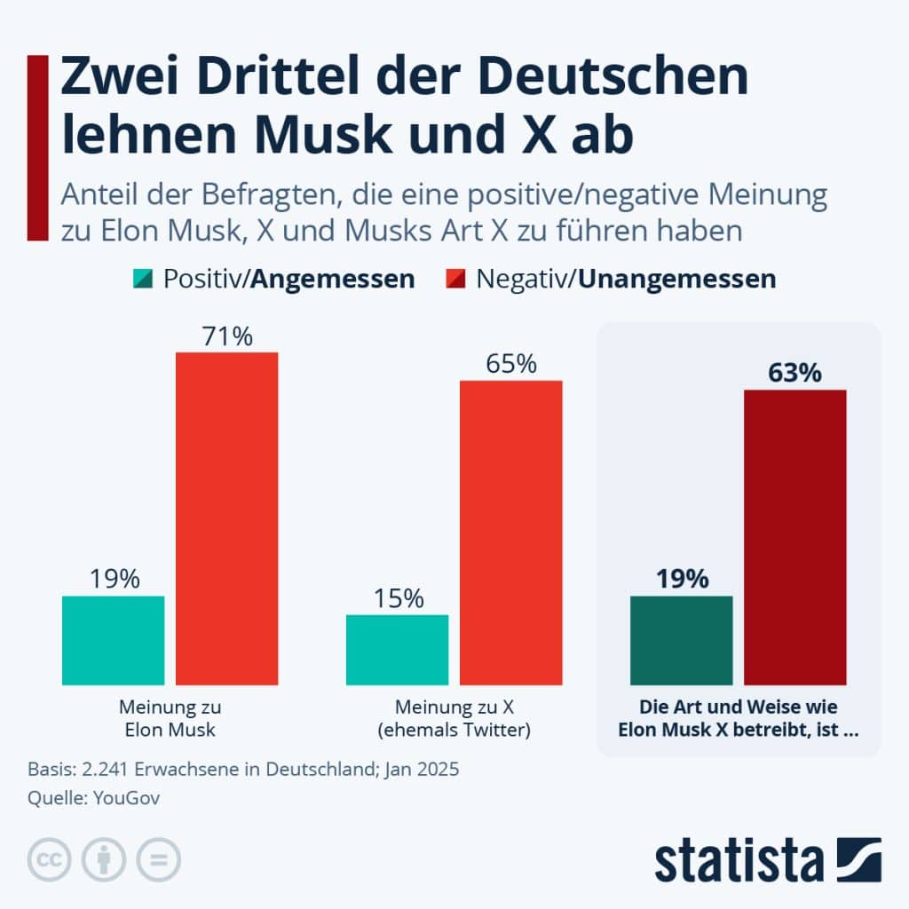 Die Mehrheit der Deutschen gehört dabei letzterem Lager an, wie eine Umfrage aus dem Januar von YouGov zeigt. Demnach haben 71 Prozent der rund 2.000 Befragten eine negative Meinung von Musk, während 65 Prozent der Befragten eine negative Meinung von X haben. Auch die Art und Weise, in der Musk die Plattform betreibt, stößt vielen Deutschen sauer auf: 63 Prozent der Befragten halten Musks Führung/Nutzung von X für unangemessen, nur 19 Prozent sind damit einverstanden. (Quelle: Statista/cw)